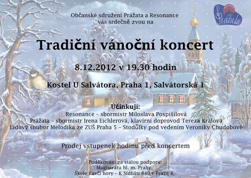 | Repertoár: | Resonance Da pacem Domine (M. Franck) Verbum caro factum est: Y la Virgen le dezia (anonym) Avinu malkenu (W. Rogers) Signore delle cime (G. d. Marzi) Prážata Andělé zpívají (C. Legros) Byla cesta, byla ušlapaná (A. Tučapský) Co se tak svítí (A. Tučapský) Purpura (J. Šlitr, J. Suchý) Rolničky (R. Charles) All I want for Christmas (L. Lukáš) Resonance The Little Drummer Boy (H. Simeone) Ring Christmas Bells (M. Leontovich) Novina velmi dobrá (K. Sklenička) Anděl pastýřům zvěstoval (K. Sklenička) S pastýři pospíchejme (K. Sklenička) Koleda z Podkrkonoší (V. Frühauf) Tichá noc (K. Sklenička) Melodika, Prážata, Resonance Já malý přicházím koledovat (K. Sklenička) |