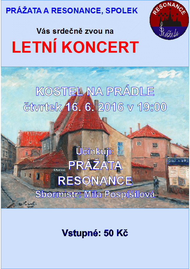 | Repertoár: | RESONANCE Cum decore (T. Susato) Alleluia (G. Young) Lascia ch´io pianga (G. F. Händel) Signore delle cime (G. d. Marzi) Mas vale trocar (J. Encina) Tourdion PRÁŽATA Týnom, tánom (lidová) Jede sedlák (J. Krček) Proměny (lidová) Chakutumaini sina (tradicionál) Epo I tai tai (N. Zéland) Hoja hoj (K. Svoboda) Každý den (Uhlíř, Svěrák) Hava nagila (hebrejská) King of Kings (hebrejská) Ievan Polkka (Loituma) RESONANCE Išla Marina (J. Hanuš) Mila moja (M. Raichl) Pod Prešpurkem (J. Hanuš) Růže kvetou dál (G. Bécaud) Ja - Da (B. Carlton) Can't help falling in love (G. D. Weiss) The lion sleeps tonight (G. D. Weiss) |